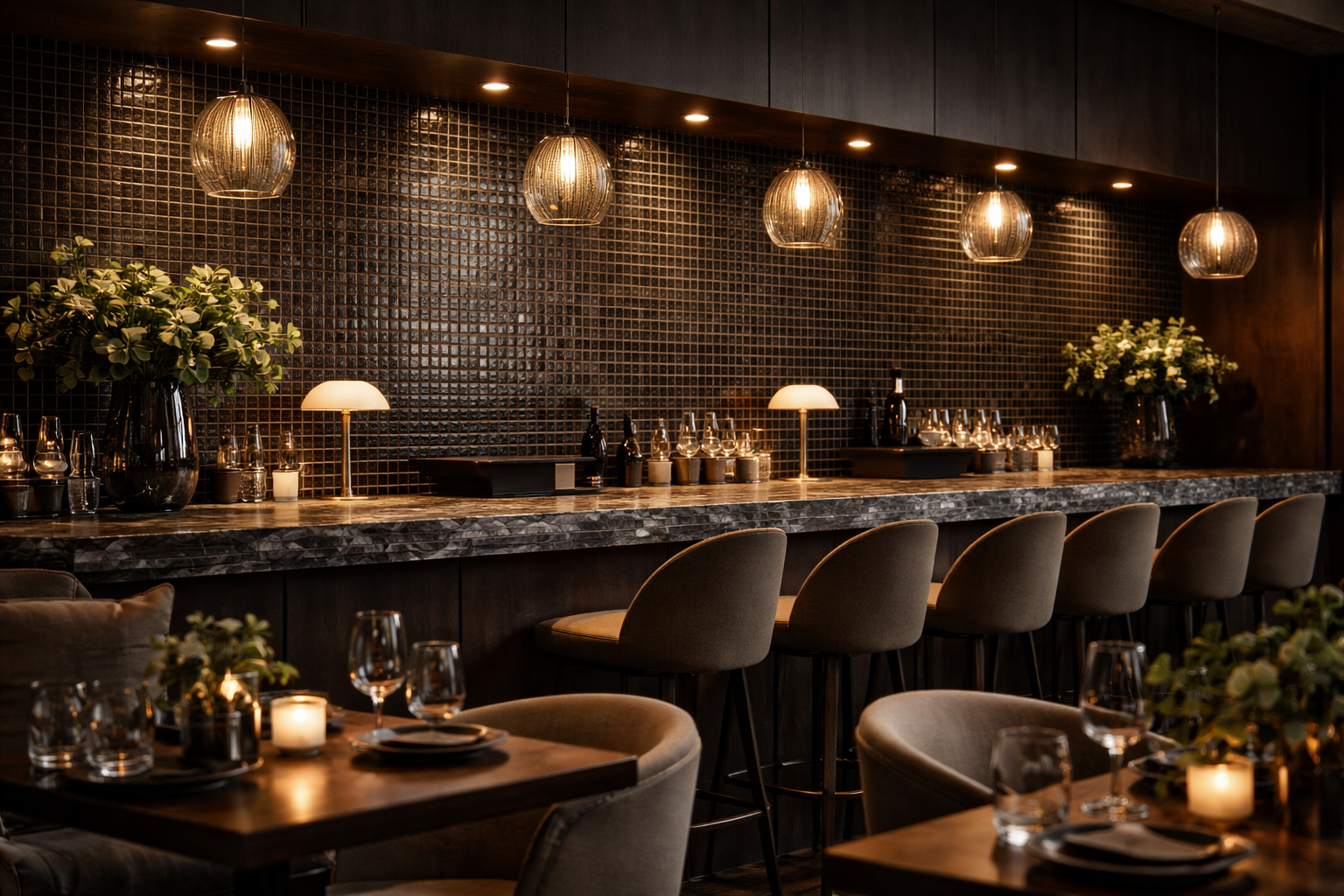 Акцентные стены, барные зоны и интерьерные панели с уникальной игрой света.